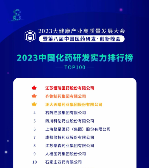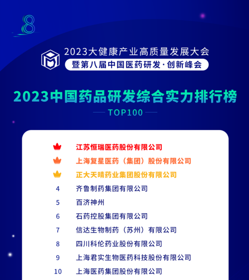 由药智网、中国药业杂志社主办的2023大健康产业高质量发展大会暨第八届中国医药研发•创新峰会于6月16日开幕,会上发布了《2023中国药品研发实力排行榜》系列榜单,金年会医药凭借深厚的创新研发实力再创辉煌:荣登《2023中国药品研发综合实力排行榜TOP100》榜首、《2023中国化药研发实力排行榜TOP100》榜首。值得一提的是,今年是金年会医药连续第6年入选《中国药品研发综合实力排行榜》榜首。